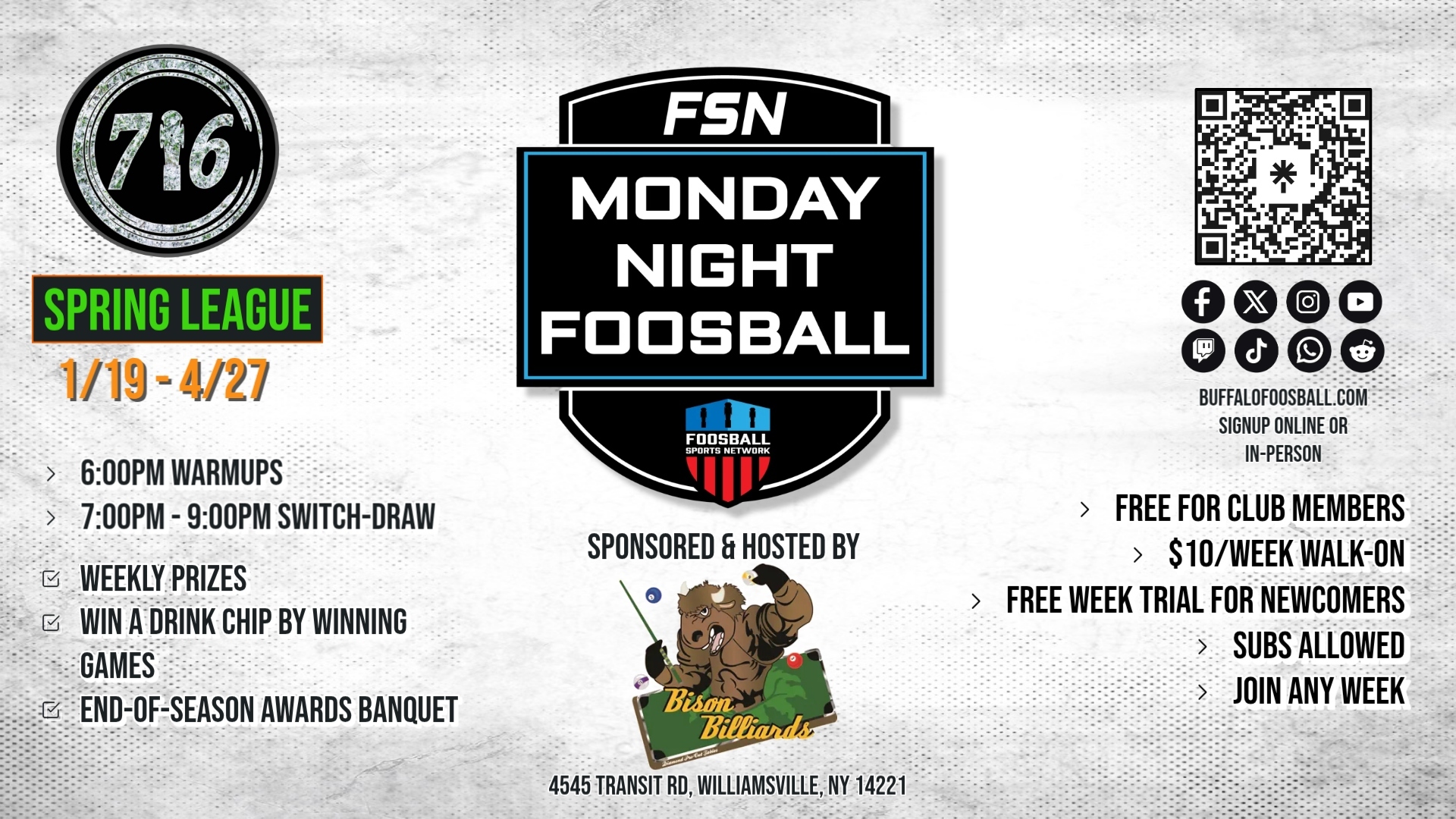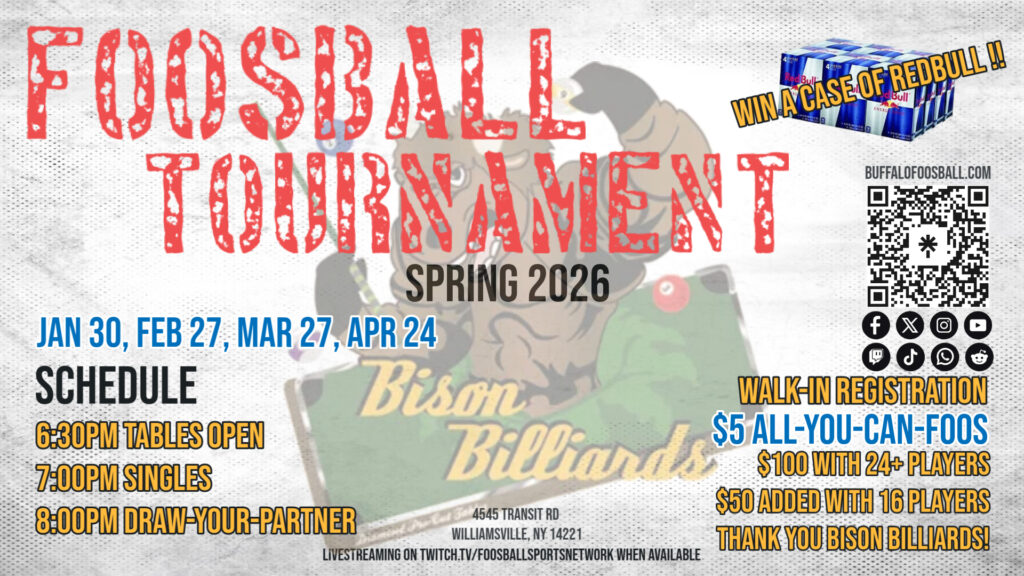 Buffalo Foosball and Rochester Foosball are not-for-profit community groups dedicated to promoting local competition and camaraderie, with all funds supporting event costs.